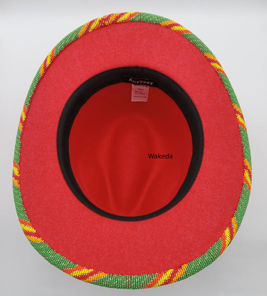 Beaded Wool Blend Felt Fedora Hat with Matching Earrings - Red Hat with Green Orange and Red Spiral Beadwork