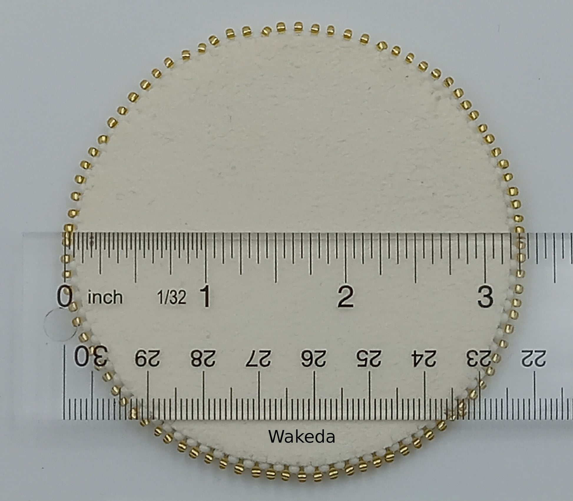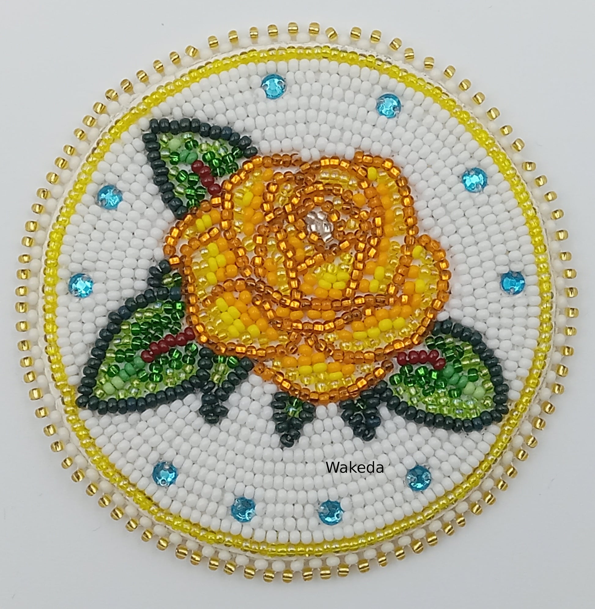 3 1/4" medallion beaded in applique / flatstitch style using 11/0 Czech seed beads in yellow and orange with white background, blue rhinestones and white and silver lined gold picot edging.