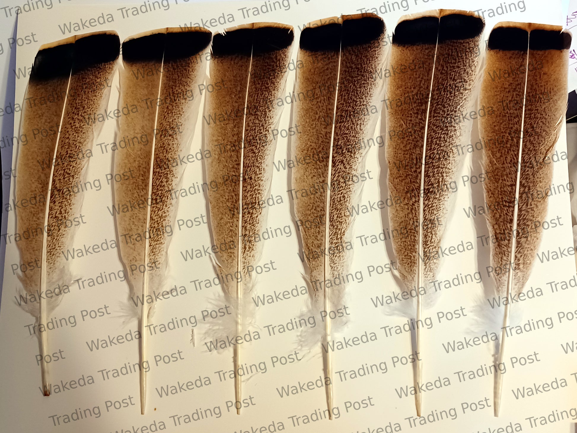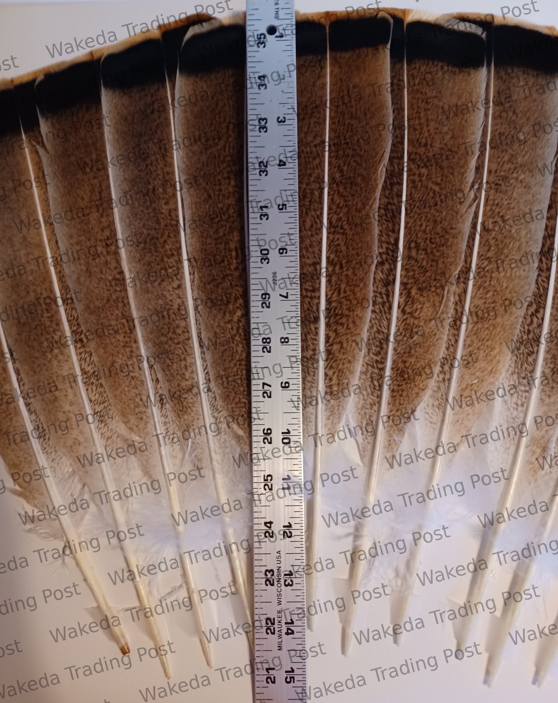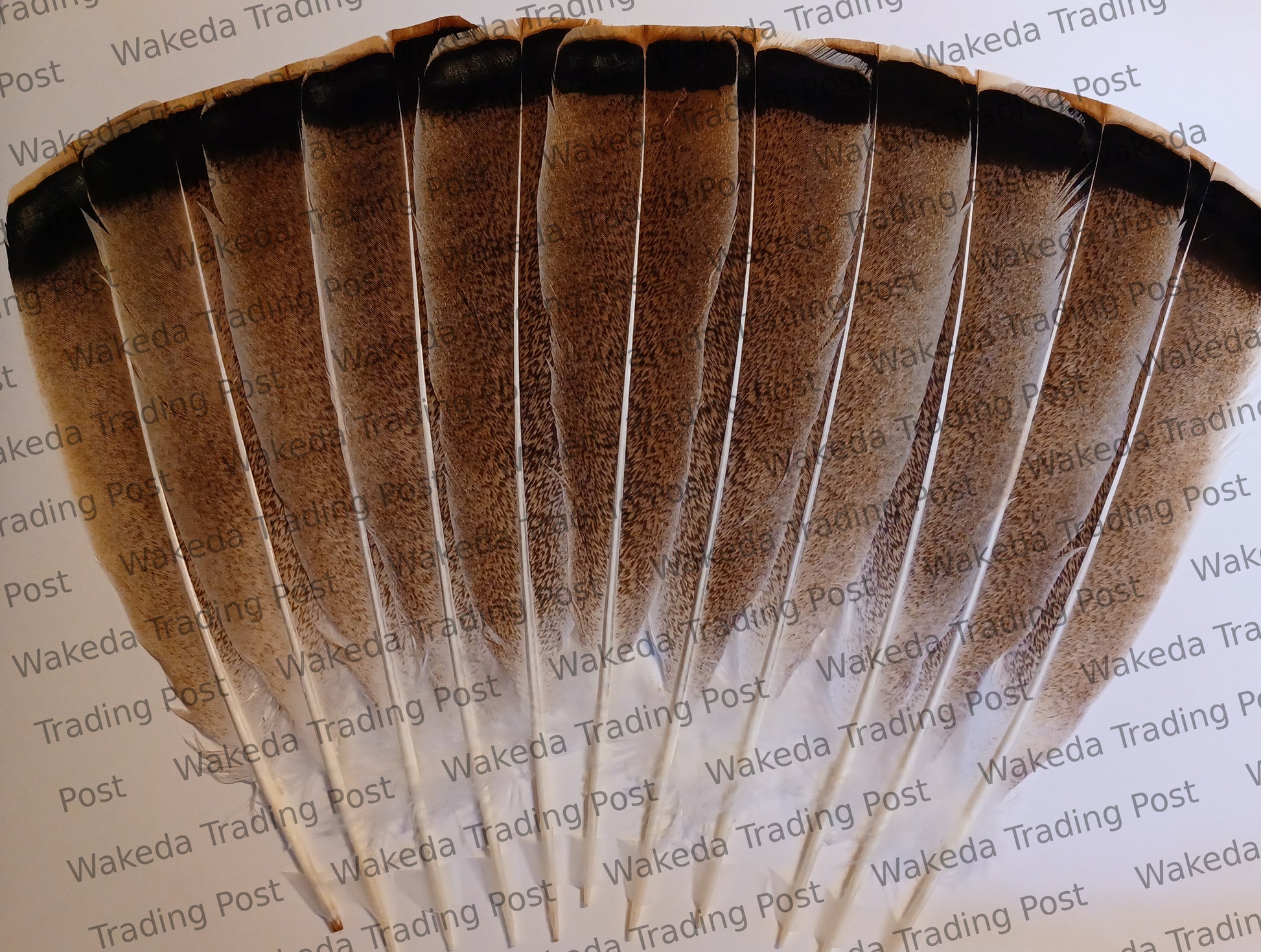 These legal feathers are from free-roam ranch-raised hybrid turkeys. They are sometimes called legal eagle, dapple, penciled, mottle, sweetgrass, marbled, black Spanish, white Holland, chocolate, palm, bronze, phoenix