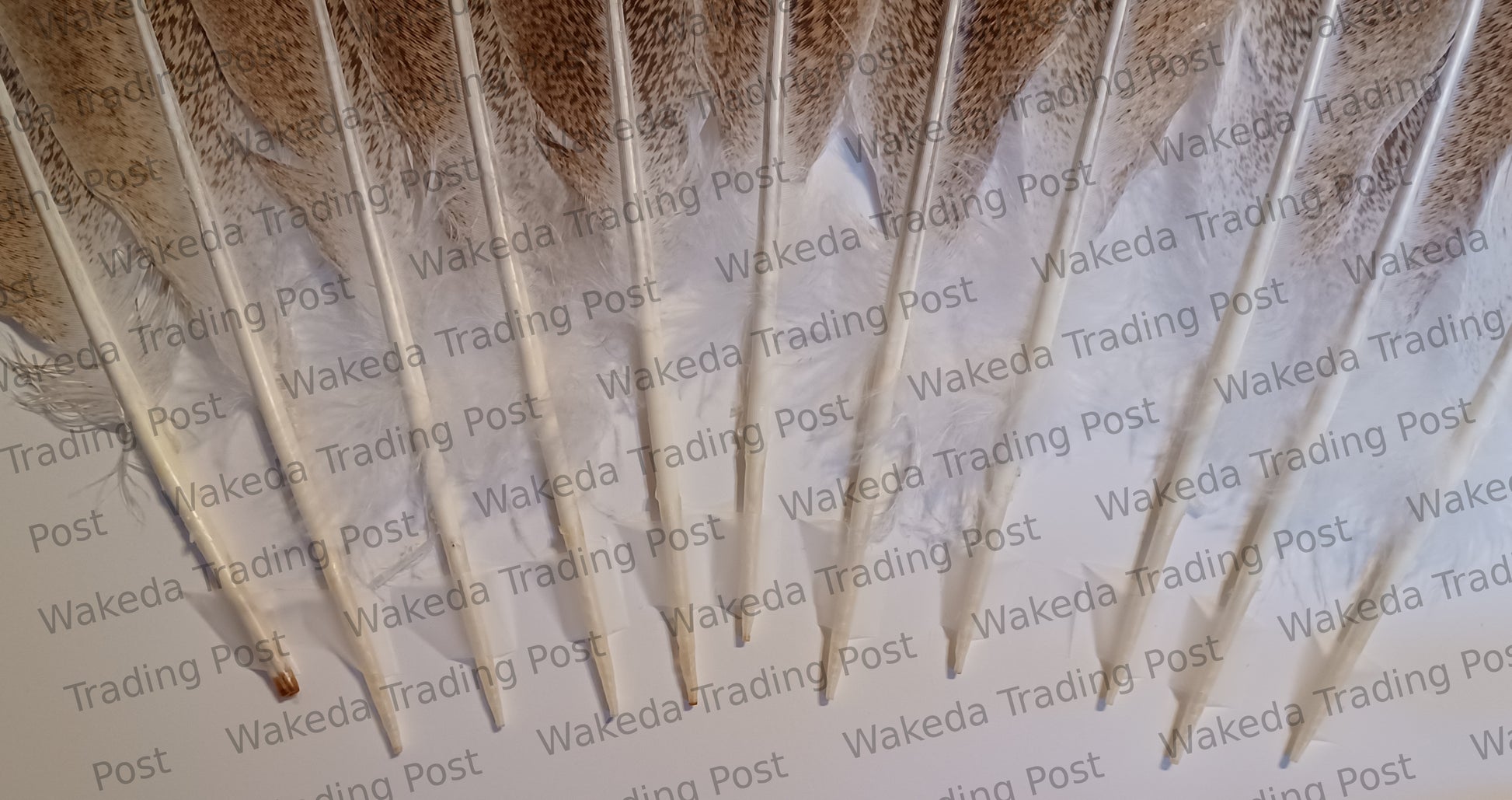 Because it is not possible for most people to possess feathers from protected birds of prey (eagle, hawk, owl, etc), we are offering a legal alternative. They are not painted, dyed, bleached, or altered in any way. By trimming these specially bred turkey feathers you will be able to create quality craft items that can replace and/or replicate those made with illegal feathers. These feathers can be washed, preened, trimmed, dyed, straightened... anything that you would do with a natural feather.