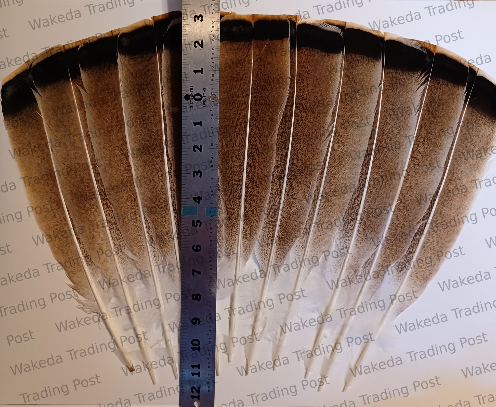 11 matched tail feathers, 5 lefts, 5 rights, 1 center. This coloring makes an awesome tail fan and is also very popular to cut down to an appropriate size to imitate a red tail hawk.